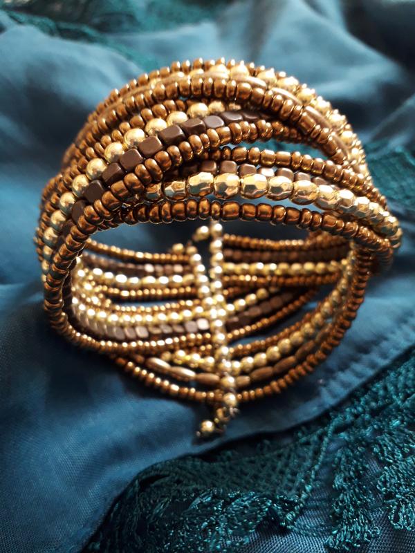Очень красивый браслет, золотисто-бронзовый, бусины на металлической основе, размер регулируется по руке. Шикарно смотрится и днем и вечером. Если берете 2 и больше вещи, сделаю скидку)