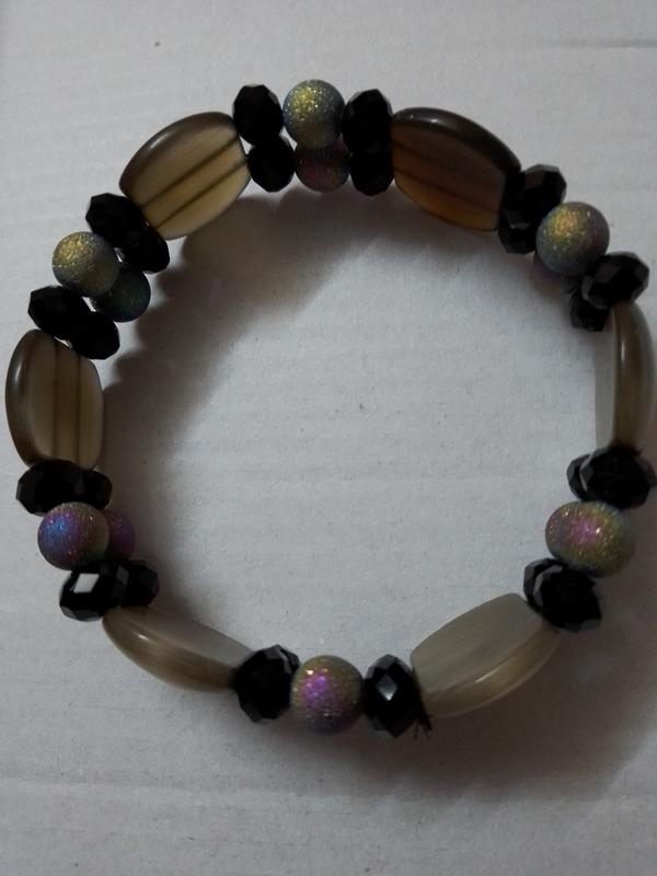 браслет на резинке. кошачий глаз, чешское стекло и бусины из стекла с разноцветным напылением. одна бусина кошачьего глаза с маленьким дефектом, но это не скол. смотрите на последнем фото. размер внутри 19см.