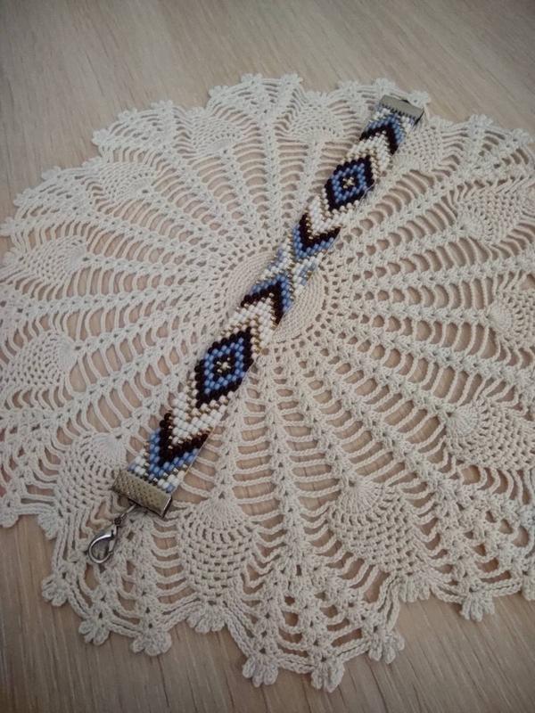 Браслет из бисера НОВЫЙ. Ручная работа. Бисер "Preciosa", Чехия (10) Цвета - белый + голубой + коричневый + золотистый. ЗАМЕРЫ: Длина с застёжкой - 18 см Ширина - 1,4 см