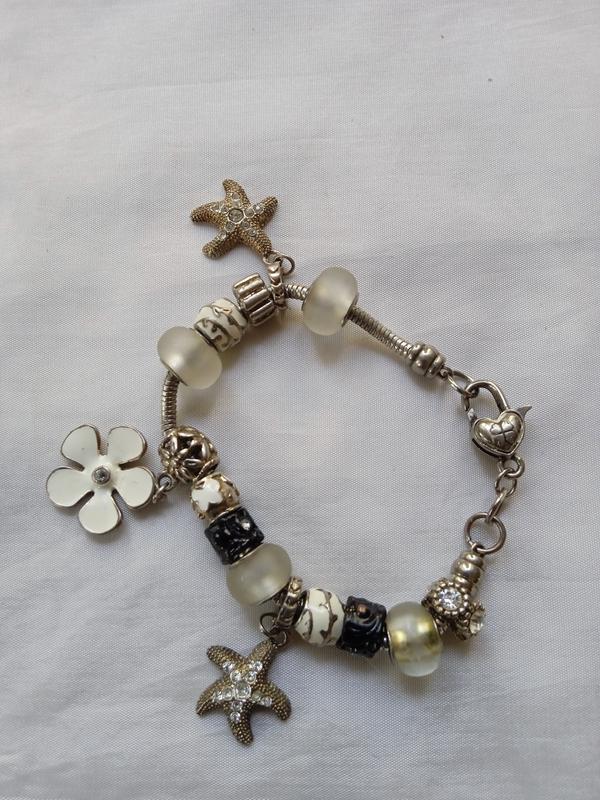 Браслет из хорошего сплава. Тяжёлый. Бусины стеклянные. Цветок с эмалью. Не ржавеет.Очень приличный . Шармы не снимаются.
