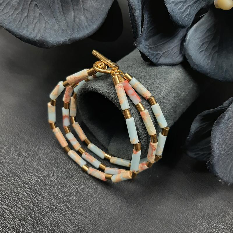 Модный современный трехрядный браслет с амазонитом от голубого до розового цветов. Фурнитура - латунь.