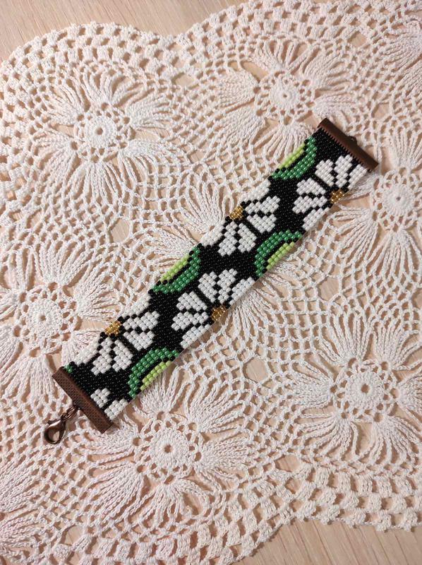 Браслет из бисера "Ромашки" НОВЫЙ. Ручная работа. Бисер "Preciosa", Чехия (10) Цвета - белый + чёрный + зелёный + салатный + золотистый. ЗАМЕРЫ: Длина с застёжкой - 17 см Ширина - 2,7 см
