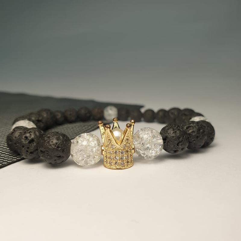 Браслет унісекс, для жінок, та чоловіків. Чорна лава, білий гірський кришталь, та золота коронка гарної якості💥