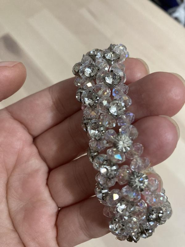Браслет з кришталевих намистин Aurora Borealis, на резинці, з вставками зі стразів. Один замінений на страз Сваровські, при носінні не помітно. На худеньку руку, резинка розтягується не сильно