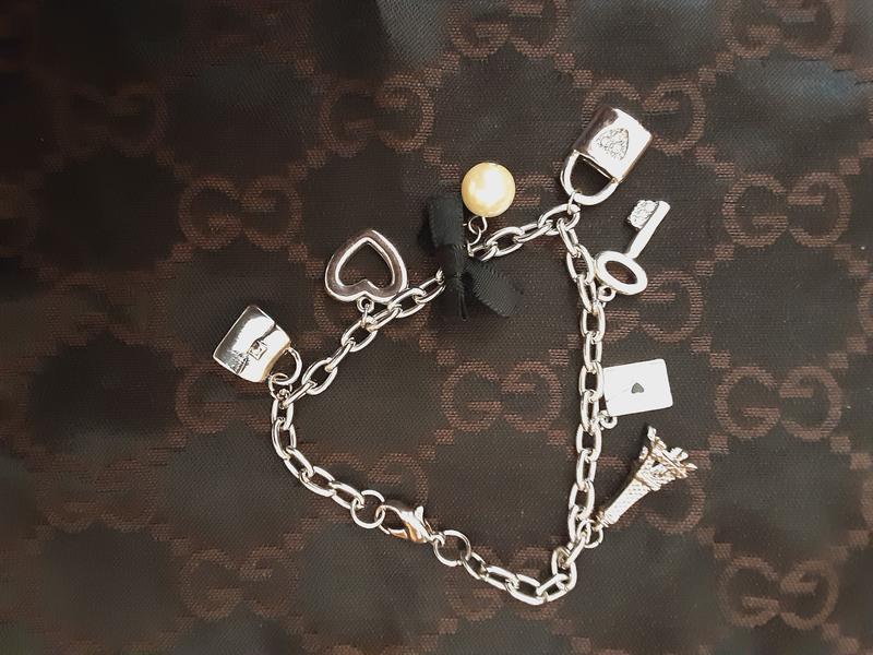 красивый браслет с подвесками в стиле Диор,эмаль,камешки,жемчужина,бантик,белый металл,без следов носки