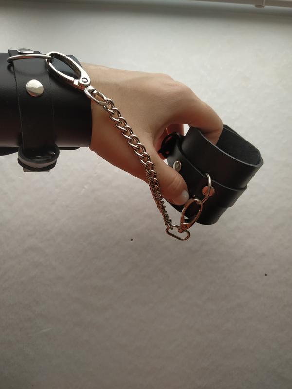 Наручники у натуральній шкірі. Розмір універсальний (регулюються від 15до22 см) Ланцюг із карабінами може бути інший на вигляд. Шкіра кайзер,не розірвеш,не розтягнеш. Кольори на вибір:чорний,червоний,білий. Відправляю тільки новою поштою є післяоплата на пошті. Можете оформити через шафу.