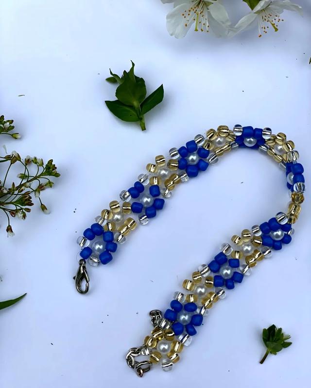 Браслет з бісеру та перлин 💎 ручної роботи Довжина 17 см+ 5 см ( ланцюжок) Зроблено з 💛💙