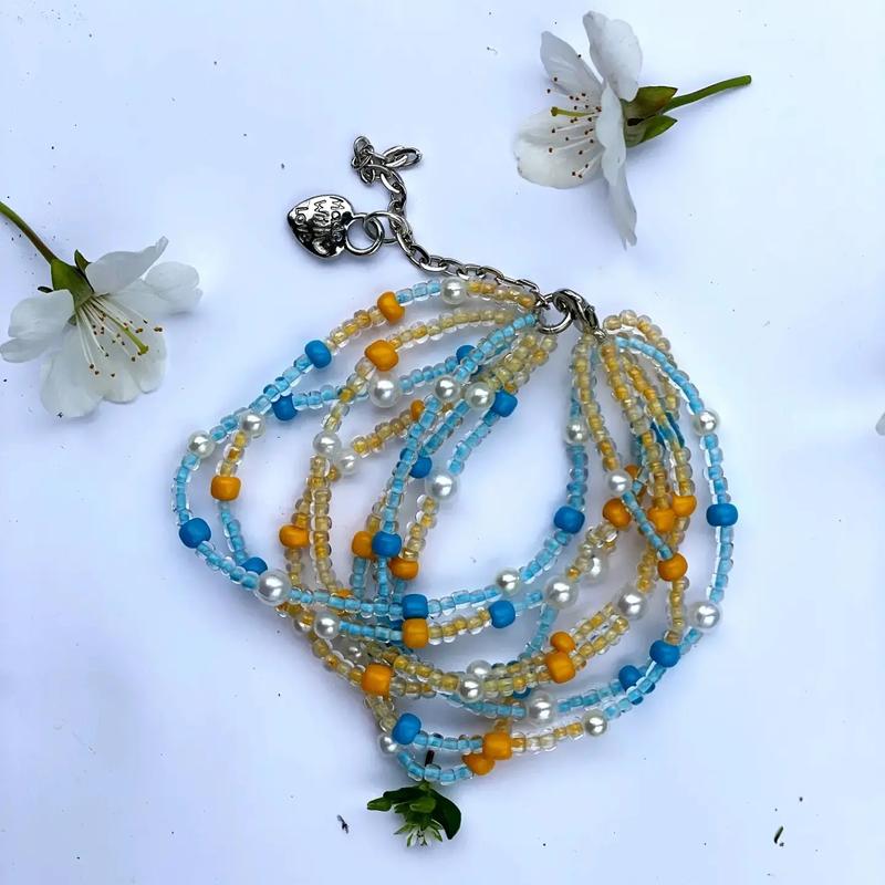 Браслет 6шаровий з бісеру, намистин ,з підвіскою " зроблено з 💛💙 Довжина -17 см + 5см (ланцюжок)