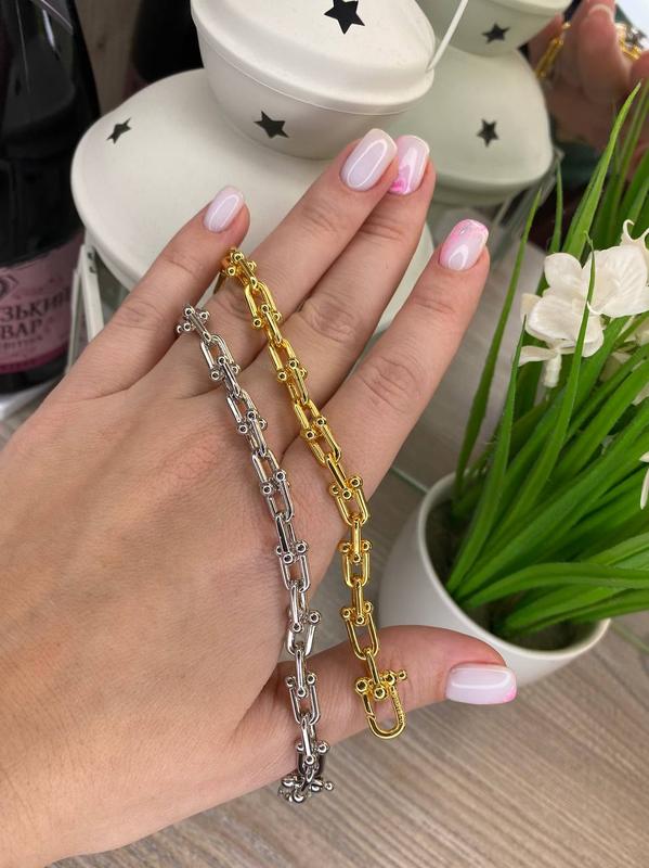 Браслет 18 см ( можно сделать больше или меньше) Сталь в позолоте, лого 750 грн Мешочек