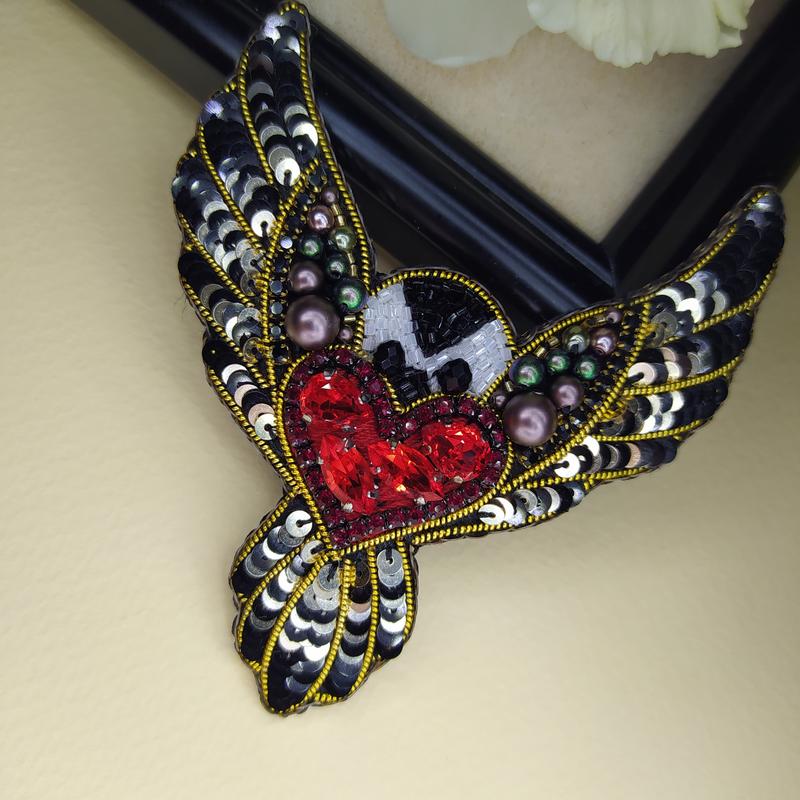 Брошка "птаха з серцем". Італійські пайєтки, японський бісер та перлини Сваровські.