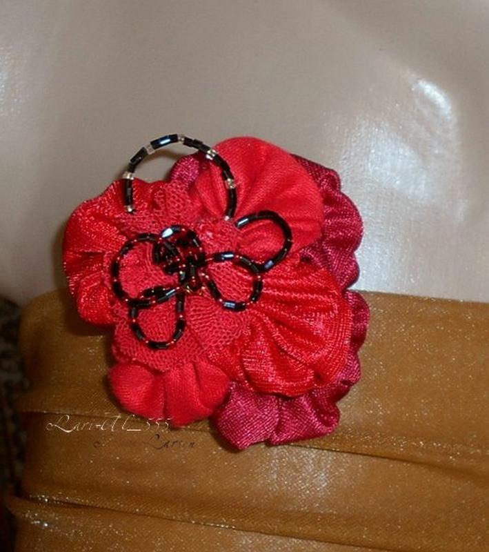 Красная брошь (в двух оттенках красного), украшенная бисером Размер броши 8 х 7 (см)