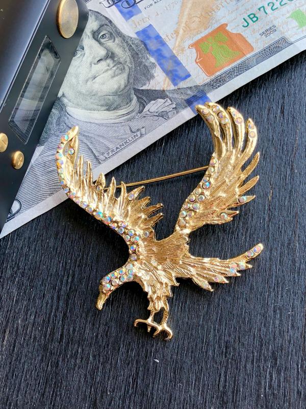 Эффектная винтажная брошь в виде ястреба, готового атаковать свою цель. Выполнена из бижутерного сплава цвета бледного золота, украшена кристаллами Aurora Borealis очень деликатного светлого оттенка. Прекрасная динамика, детализация, состояние идеальное, замочек и игла без нареканий. Брошь-обещание, брошь-настроение, брошь-возмездие и расплата. Вчатляющий дизайн, точно передающий готовность к атаке и неотвратимость победы!