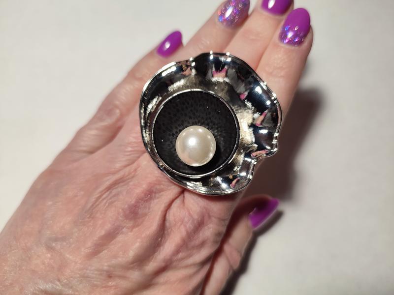 Брошь -кулон , серебристый металл, белая жемчужина Майорка, эмаль.