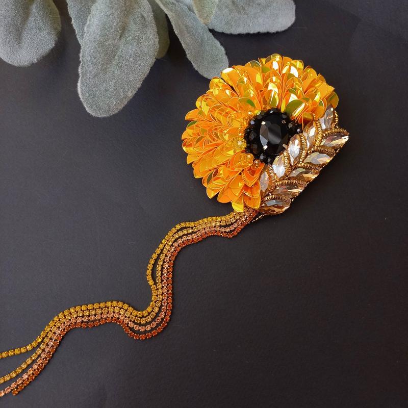 Продам брош в виде цветка сония. Материалы: стразы, хрусталь, лелетки, мягкая канитель, стразовые цепочки, натуральная кожа, японская фурнитура, чешский микробисер. Это отличный аксессуар к вашей одежде) 😁❤️🥰🇺🇦💛💙