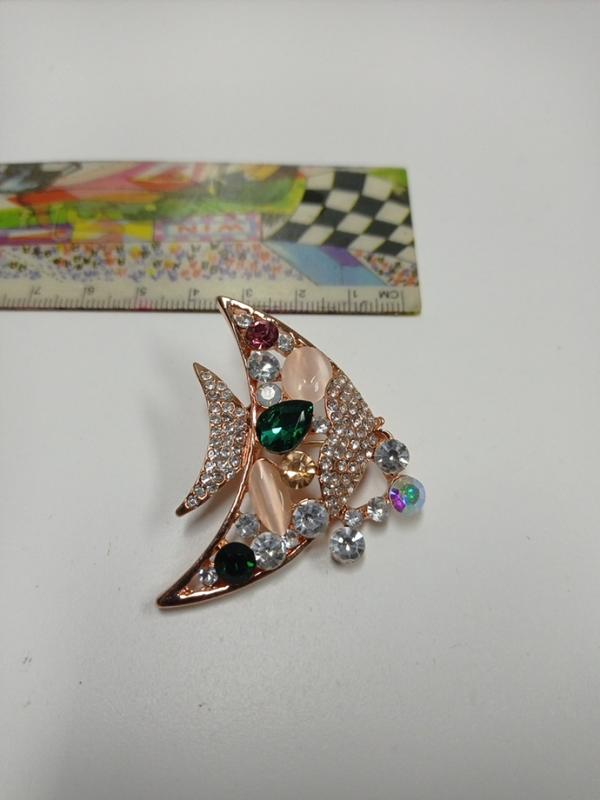 брошь в виде рыбки,желтый металл, много разноцветных камушков,очень элегантно смотрится...приятный подарок