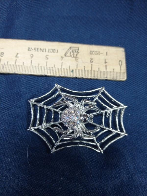 брошь паутинная, красиваще осадка белыми камушками, ажурная, изготовление из белого металла с паучком внутри паутинки, искателя...