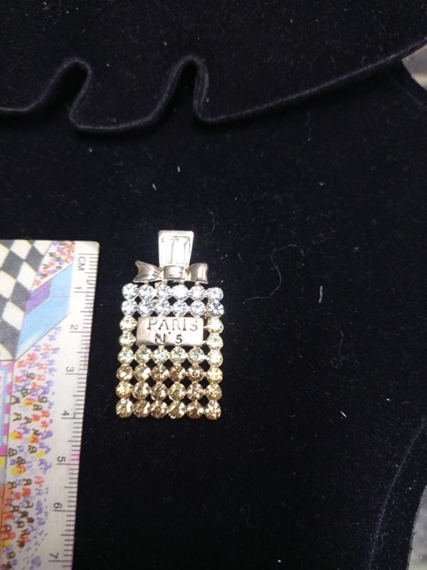 брошь бутылка..оригинальная брошка стилизована под бутылку с под французских парфюмов..желтый металл..украшена камушками в гамме от белых до желтых... довольно интересная вещь..
