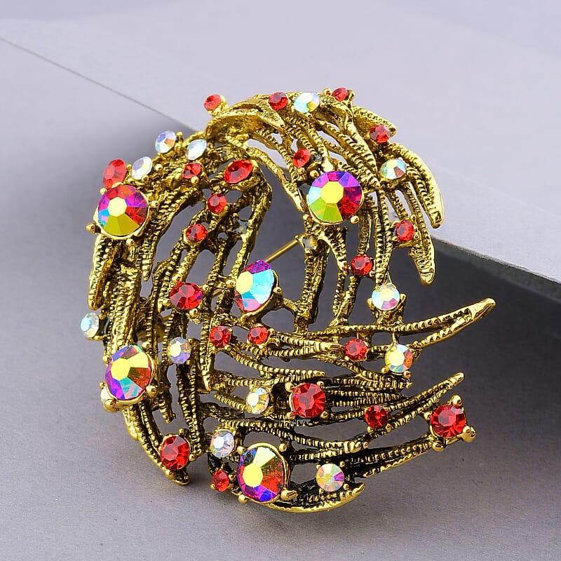 Артикул: 100410 Размер: 55х50 мм. Тип замочка: Булавка Материал: Бижутерный сплав Покрытие: гиппоалерген(з) Камень: Сrystal Цвет: Красный Цвет3: Золотой Вес: 29,46 г.