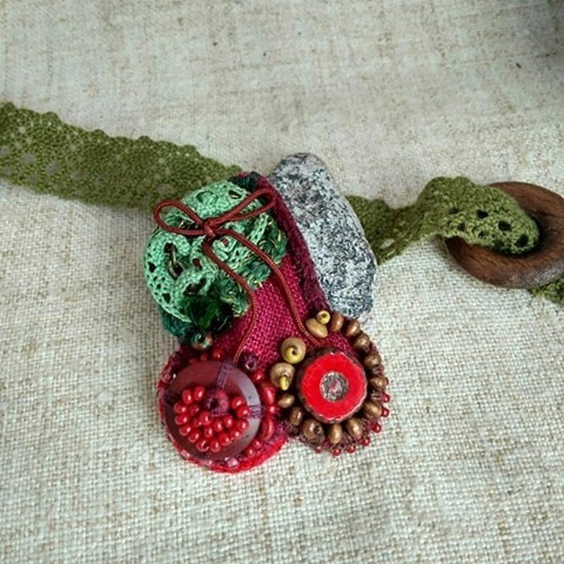 Льняная брошь с этническими бусинами и нарядными кружевами, а также есть хрусталь и деревянные элементы. Размер: 5,5 * 4см. Дополнительные характеристики: Пол: Женский Тематика: Фрукты Материал : Бисер Материал : Бусины Материал : Дерево Материал : Кружево Материал : Металлическая фурнитура Материал : Ткань