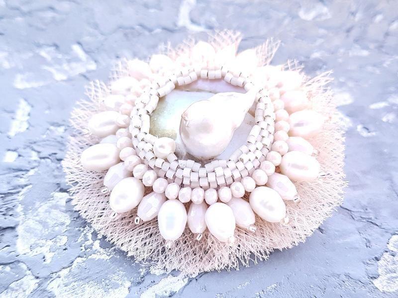 Неидеальное совершенство. Мы приходим в этот мир неидеальными. Женщины, у нас при рождении нет ни зубов,ни струящихся локонов, ни роскошных густых бровей ))), ни желанных форм и округлостей. Представьте глаза мужчины, которому описывают портрет будущей возлюбленной : нет зубов, нет волос, нулевой размер...))) Мы не умеем ходить, не умеем разговаривать ( пока что не определилась, это достоинство или недостаток ))), не умеем готовить( все мужчины недовольно нахмурились ))), даже попу себе вытереть не можем... ))) А ещё у всех у нас - непропорциональные черты лица и левая часть от правой - сильно отличается. Пару лет назад в сети "гулял" тест, в котором лица знаменитостей показали "отзеркалеными" по одной из сторон (левой или правой). При этом зрителям предлагалось просто визуально оценить степень привлекательности этих лиц, не сообщая о деталях. Большинству из опрашиваемых эти лица показались не просто некрасивыми, а уродливыми! Мы - неидеальны. И вместе с тем мы - совершенны! Все остальное у нас БУДЕТ, вырастет, отрастет, созреет. Просто немножечко позже. У каждой - в свое время. Как важно принять то, что мы - неидеальны, и не стремиться изо всех сил соответствовать какому-то, часто, вымышленному образу "идеальной женщины", "идеальной жены", "идеальной матери"... Неидеальны, но СОВЕРШЕННЫ. Венец Божьего творения. Любимы. Красивы. Желанны. Драгоценны. Как эта жемчужина в броши. Она имеет неправильную форму, да ещё и приросла к своей "материнской" ракушке. С удовольствием украсит тебя - неидеальную, но совершенную. ____________________________________ Стильная лаконичная роскошная брошь из натурального белого жемчуга высокого класса нескольких разных размеров и форм, выполненная в технике вышивки, расшита натуральным белым жемчугом и хрустальными бусинками. По центру - натуральная жемчужина, приросшая к материнской ракушке перламутра. Цвет: ivory ( слоновая кость). Диаметр броши: 55 мм _____________________________________ Под заказ могу сделать такую , или же совершенно другую БРОШЬ с жемчугом, кристаллами , цирконами, камнями - ДЛЯ ВАС! Можно заказать в комплект парную брошь на туфли , или на сумку. Пишите свои пожелания в личном сообщении. В комплект к броши могу сделать СЕРЕЖКИ, КОЛЬЦО, КОЛЬЕ или БРАСЛЕТ в аналогичном стиле. Фантазируйте - и украшайте свои повседневные или праздничные наряды эксклюзивной авторской брошью. Дополнительные характеристики: Пол: Женский Тематика: Цветы Материал : Бусины Материал : Жемчуг Товар под заказ