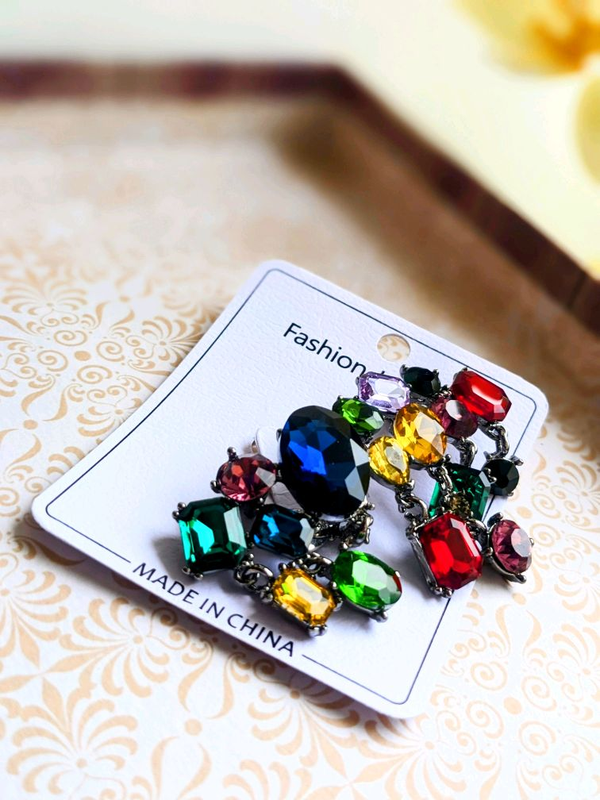 Красива брошка. Камені всі на місці, дуже гарно переливаються! Нижній ряд вільно на кільцях бовтаються і додатково грають на світлі. Голка гостра, тканина не зробить затягування. Колір металу темне срібло.