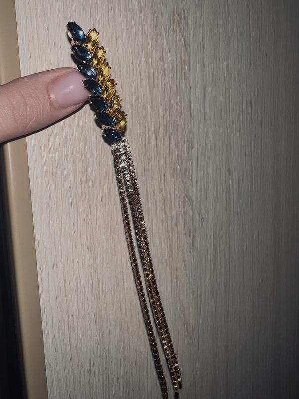 Голубо желтая брошь-колосок с цепочками