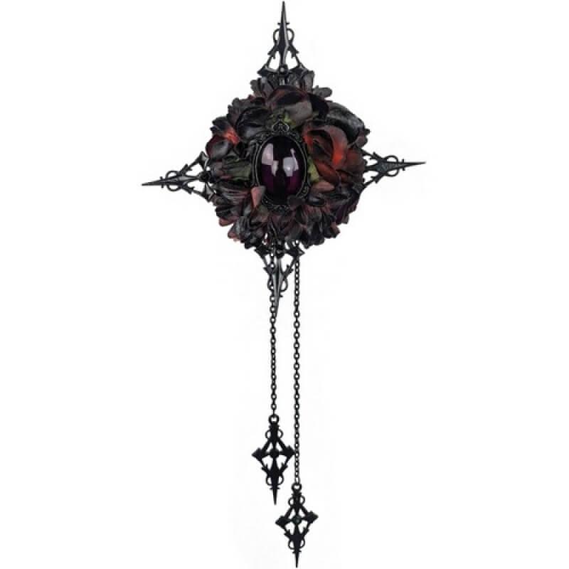 Брошка Корольова Гертруда 24-551BLK-Plum Оригінальна брошка з квітів декорована каменем та підвісками, ідеальне доповнення для карнавального образу. Розмір – 12,5х11,5 см. Довжина підвіски – 17 см.