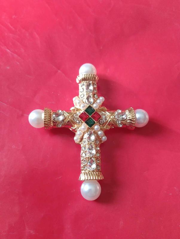Брошь крест с жемчугом инкрустация фианитами