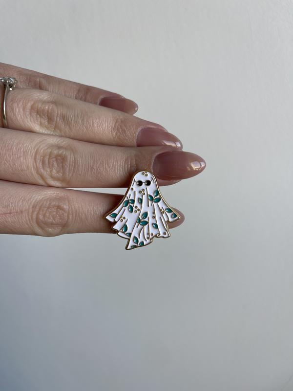 Милий пін значок у формі білого привида, прикрашеного зеленими листочками та золотими краплинками. Стильно поєднує осінній настрій та чарівну загадковість. Ідеальний аксесуар для рюкзака, куртки чи подарунка з душею. У наявності лише 1 шт — ексклюзивний і унікальний екземпляр! Подарункове упакування можна додати за окрему плату — від 10 грн до 30 грн (вартість залежить від розміру коробочки).