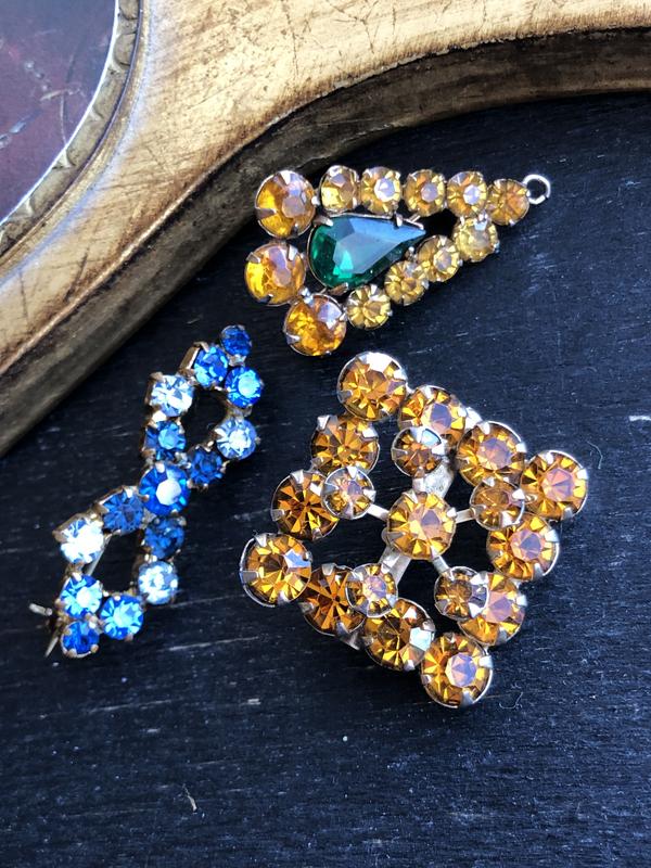 Три миниатюрных брошечка производства Чехословакии середины прошлого столетия. Выполнены, традиционно, из латуни и ярких кристаллов "вкусных" красивых оттенков. Стан отличный, брош-треугольник имеет петельку (нафевно, потерянная подвеска). Отличные брошки для поклонниц миниатюрных, неприхотливых украшений!