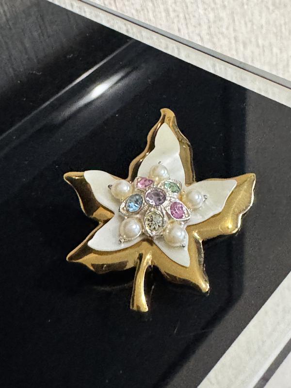Вінтажна брошка з латуні у вигляді листя клену з інкрустацією перламутру.