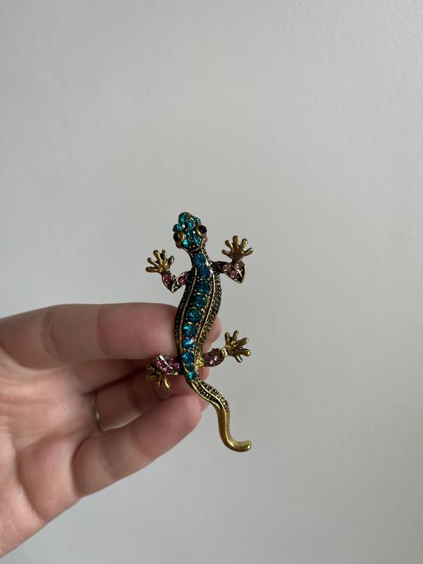 Ця вишукана брошка у вигляді ящірки зачаровує своїм дизайном! Її тіло оздоблене бірюзовими кристалами, а лапки прикрашені рожевим камінням. Золотиста основа надає прикрасі вишуканого вигляду з нотками етнічного стилю. Брошка стане стильним акцентом у вашому образі або ж унікальним доповненням до колекції прикрас. 🎁 Ідеальний подарунок для поціновувачів незвичних форм та яскравих деталей! В наявності лише 1 шт — ексклюзивна позиція! За бажанням можна додати подарункову коробочку — від 10 до 30 грн, залежно від розміру.