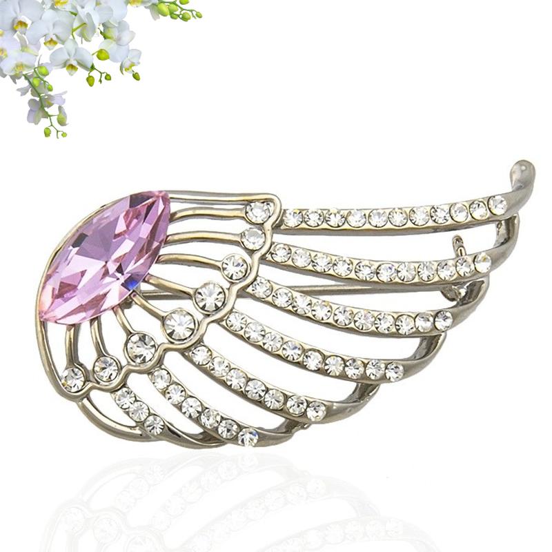 Брошка металева «Крило» здатна прикрасити будь-яке вбрання, будь-то повсякденне, урочисте або вечірнє. Також невеликий аксесуар стане в нагоді для красивого укладання косинок і шарфів. За кілька рухів руки можна зафіксувати полотно, надаючи йому незвичайні форми. Дизайн у вигляді крила вдало доповнюють стрази та великий кольоровий камінь. Брошка заворожливо мерехтить завдяки граням каменів, що грають на світлі. Такий аксесуар особливо привабливо виглядає у вечірньому вбранні, створюючи образ красивий акцент. Виріб виготовлений зі сплаву металу зі срібним покриттям. Брошка не темніє, не викликає алергічних реакцій при контакті зі шкірою. Шпилька міцна, з добре загостреним кінчиком, завдяки чому голка легко проходить через щільний матеріал, не згинаючись. Стрази надійно закріплені у осередках. Навіть через тривалий час експлуатації, зовнішній вигляд виробу лише радуватиме.