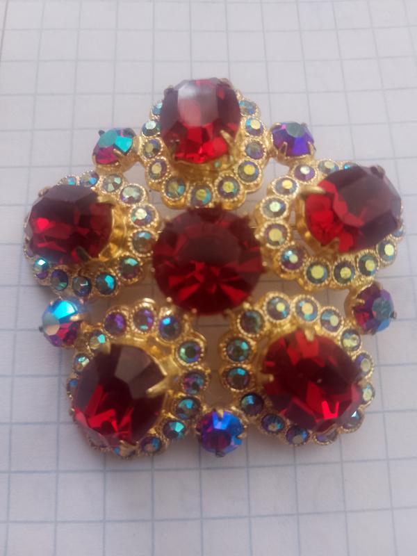 винтажная брошь выполнена в форме цветка с большими красными кристаллами и мелкими переливающимися стразами с эффектом Аврора Бореалис (AB), которые меняют цвет в зависимости от освещения. Подобные украшения часто ассоциируются с бижутерией советского периода или чехословацким производством (Яблонекс), выполненной в позолоте.