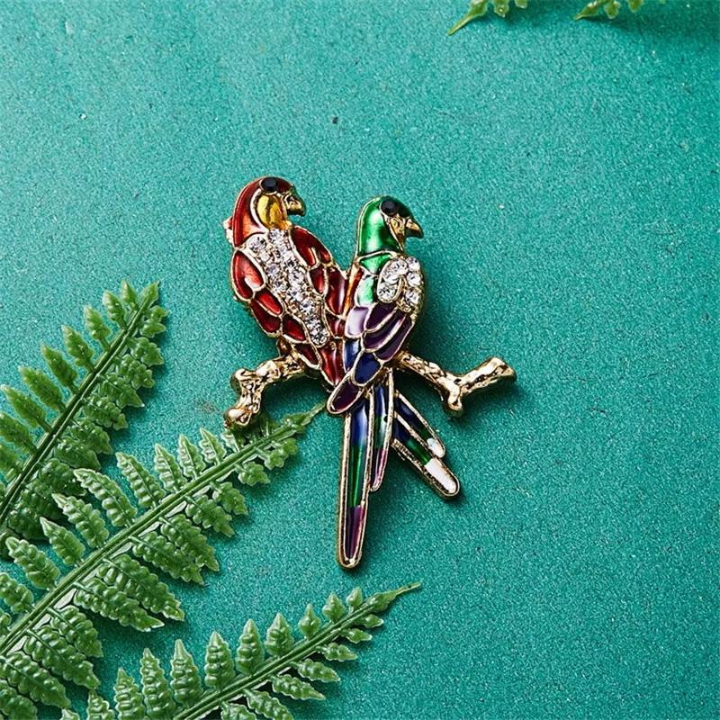 Брошь Влюбленные попугаи, пар. Основа брошки выполнена в золотом цвете, попугаи разных цветов с вставками из страз.