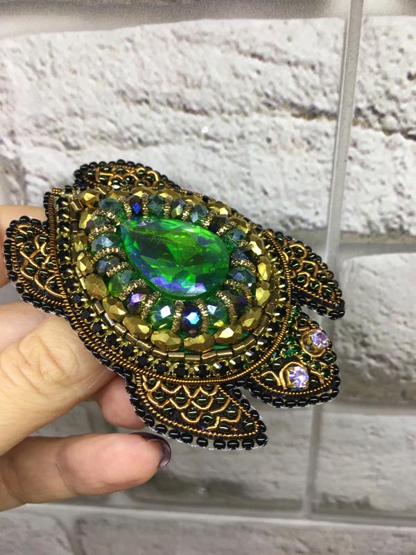Брошь выполнена из натуральной кожи, чешского бисера, биконусов, камней, стразовой цепи. Цена 550 грн