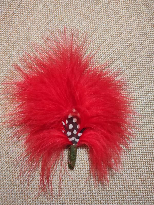 Брошь из перьев (похоже, что страуса), красного цвета. На ножке расположена застежка. Очень красиво смотрится на контрастных цветах одежды. Невесомая и утонченная. Прекрасно дополнит ваш образ.