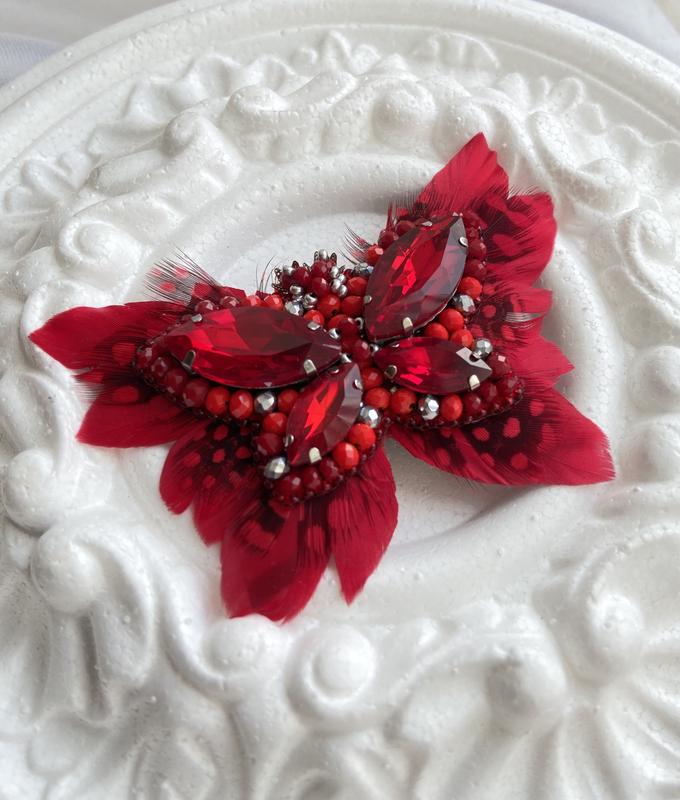 Брошь бабочка с хрустальными стразами и перьями, размер 8*6 cm