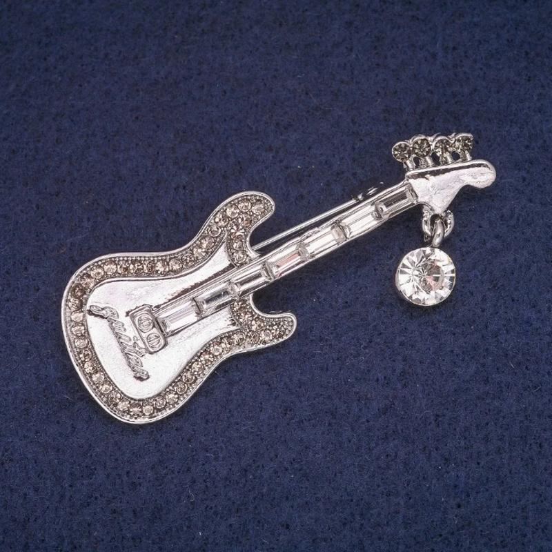 Брошь Гитара с белыми и серыми стразами, 22х57мм