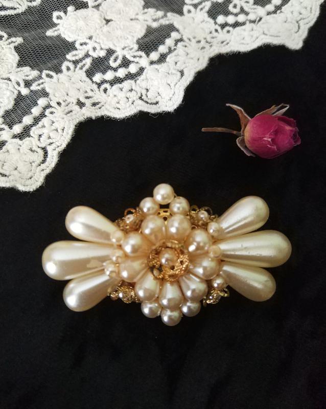 Бусини+металічна основа, застібка працює. Трохи пошкоджене покриття на одній бусині - фактично непомітно. Ширина 6 см, висота 3,2 см. Була придбана не менше як 80 років назад