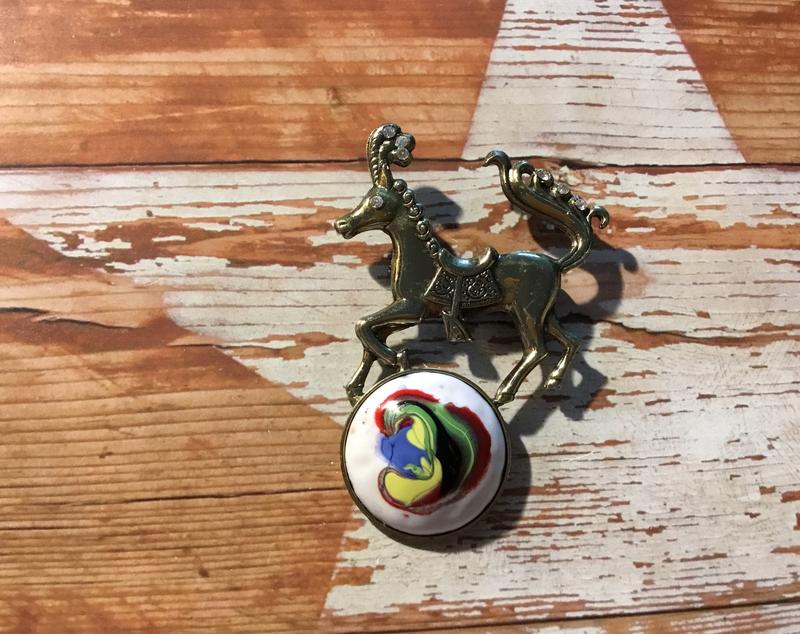 Брошь «цирковая лошадка» на шаре. Шар выполнен из керамики, лошадка украшена кристаллами, к сожалению один кристаллик утерян, что будет отражённо в цене. Общий размер броши 6,5 см на 4,5 см. Шар диаметром 2,5 см, лошадка 4 на 4 см