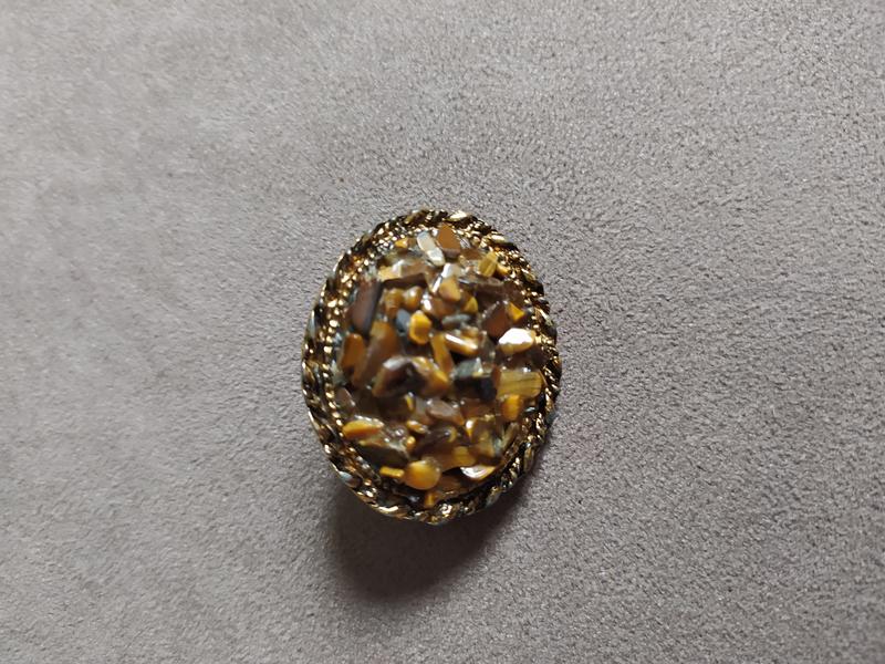 Винтажная брошка из металла в золотом тоне с крошкой камней ( тигровый глаз). Потертости на металле. Б/у. Условия совершения покупки: • Если нужны дополнительные фото или замеры — пишите, с удовольствием вам все предоставлю. • Все интересующие вопросы задавайте до совершения покупки, с радостью на них отвечу. • Товар возврату и обмену НЕ подлежит. • 100% оплата на карту Приват Банка. Комиссию оплачивает покупатель. • Доставка Новой Почтой или Укрпочтой.