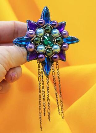 Брошка Орден виконана з намистин, металевої ланцюга та веремії. Гарно грає на світлі. Цікаве поєднання кольорів