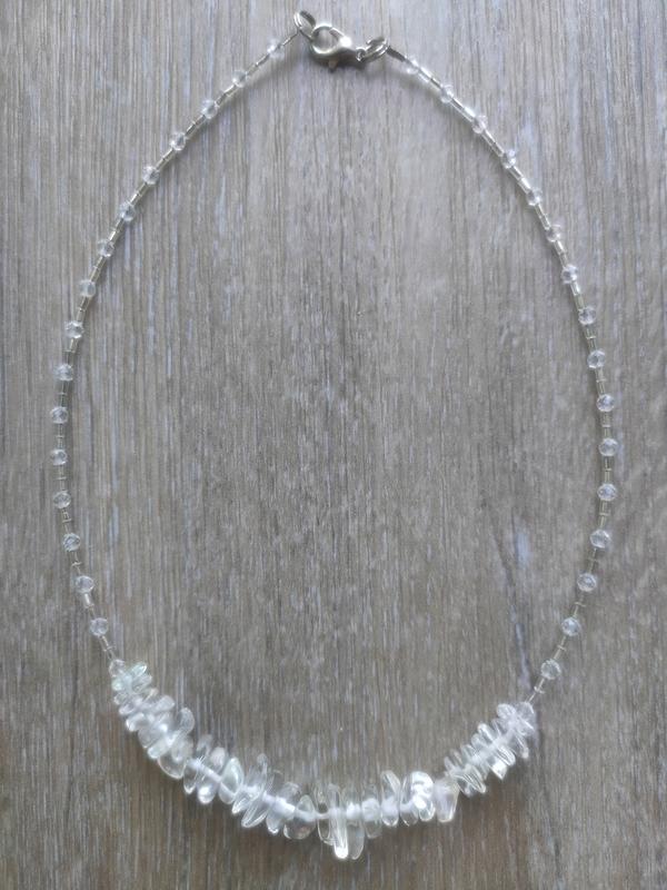Продам лаконічний, витончений чокер з намистин цирконію, крихти гірського кришталю (прозорого кварцу) та японського стеклярусу. Нанизаний на ювелірний тросик, застібка – карабін. Довжина - 39 см, можна збільшити розмір за допомогою подовжувального ланцюжка на Ваше прохання або змінити розмір самого прикраси. З усіх питань пишіть - відповім.