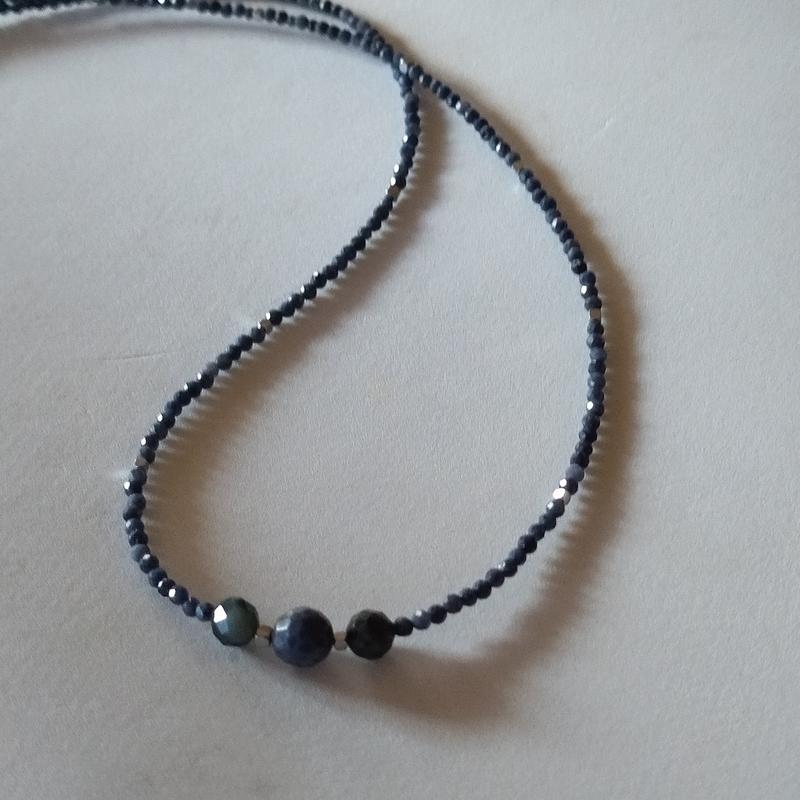 Бусы чокер из натурального камня сапфир. Сапфир месторождение Бирма. Диаметр бусин 2мм, центральная 4 и 6мм. Длина колье 38см + 7см удлинитель. Проставочные бусины из натурального камня гематит.