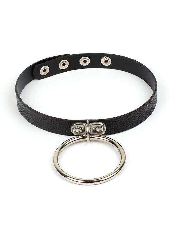 Шкіряний чокер на шию з великим металевим кільцем на чотирьох кнопках. Можна носити як самостійний аксесуар, так і з повідцем. Розмір: 40х1,5 см, діаметр кільця 5,5 см. Матеріал: екошкіра, метал.