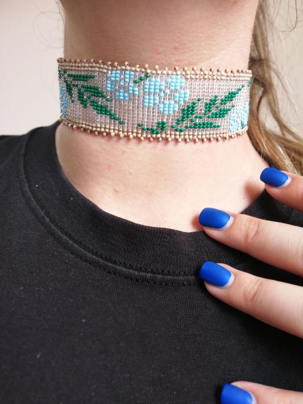 Прозрачный чекер с голубыми цветами, со края украшен бежевыми "зубчиками". Выполнен в технике ручной ткачества, без станка.