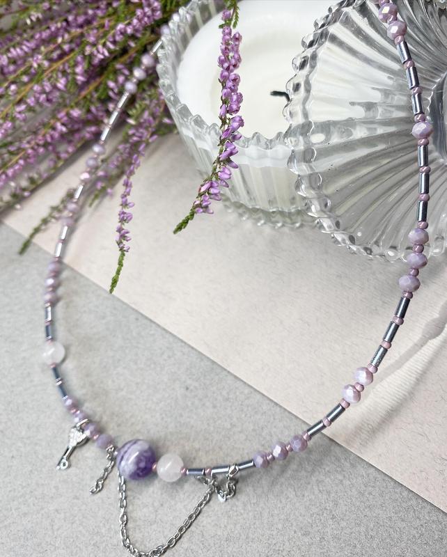 Чокер з аметистом, рожевим кварцом гематитом та ключиком