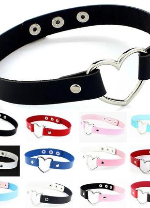 В наявності у різних забарвленнях(чорно-білий,червоний,білий,фіолетовий, рожево - білий, червоно - чорний,рожево - голубий, коричневий ) , чокер із серцем, стиль панк-рок, неоготичний, матеріал - штучна шкіра
