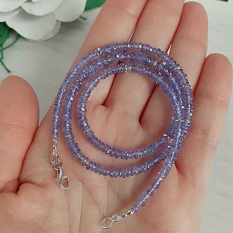 Короткое колье-чокер из плоских бусинок-ронделей натурального танзанита (камни не ювелирные). Одни бусинки идут с огранкой, другие без нее. Цвет –классический для танзанита лавандово-сиреневый оттенок. Размер бусин примерно от 1.5×3 до 3×4 мм. Длина чокера 42 см (можно добавить удлинительную цепочку) Чокер собран на ювелирный тросик производства Японии. Вставки между ронделями танзанита на чокере – серебряные бусинки. Застежка на колье – серебро.